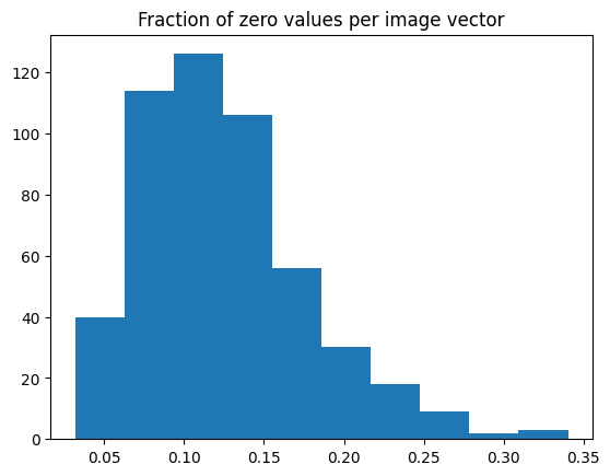 plt.title("Fraction of zero values per image vector");